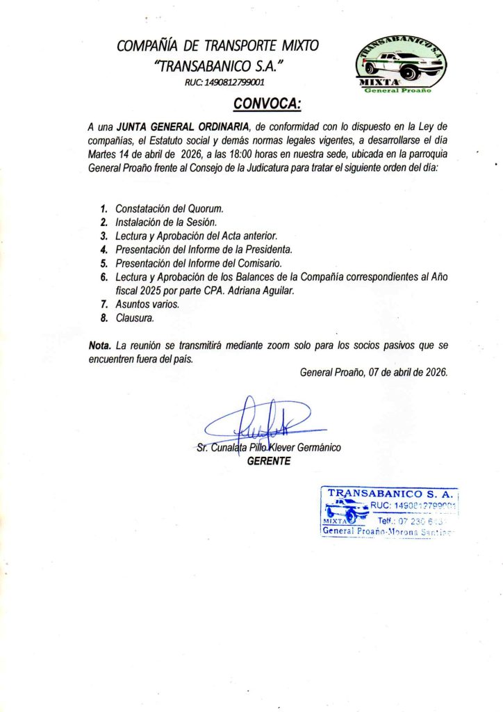 A una JUNTA GENERAL ORDINARIA, de conformidad con lo dispuesto en la Ley de compañías, el Estatuto social y demás normas legales vigentes, a desarrollarse el día Martes 14 de abril de 2026, a las 18:00 horas en nuestra sede, ubicada en la parroquia General Proaño frente al Consejo de la Judicatura para tratar el siguiente orden del día: