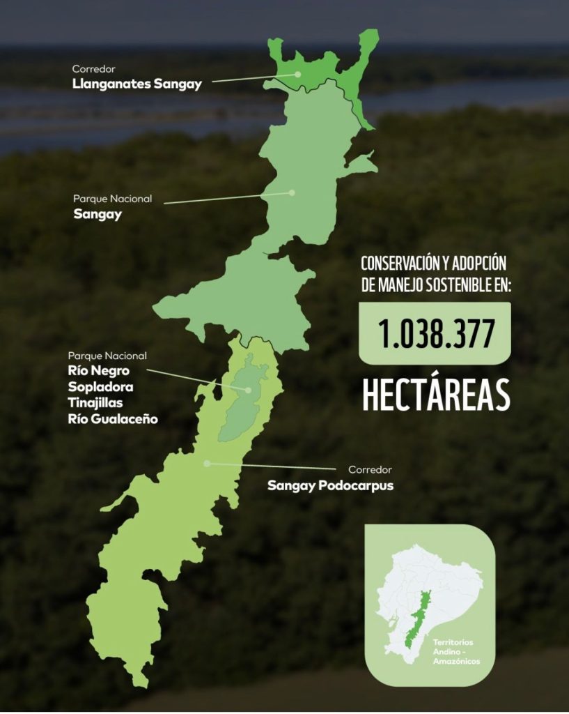 El proyecto busca proteger más de un millón de hectáreas de bosque en las provincias de Tungurahua, Pastaza, Morona Santiago, Azuay, Loja y Zamora Chinchipe, articulando los corredores ecológicos Llanganates–Sangay y Sangay–Podocarpus, donde se encuentran áreas protegidas como el Parque Nacional Sangay y el Parque Nacional Río Negro Sopladora.