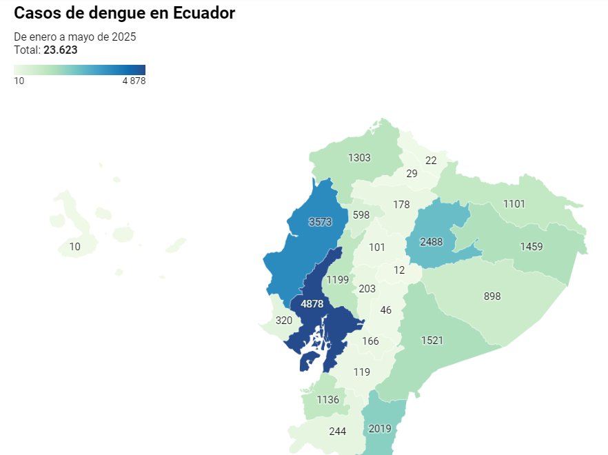 Las últimas cifras de vigilancia epidemiológica revelan que el 90% de los casos de dengue se concentra en diez provincias y a la cabeza se ubican dos de la región Costa: Guayas y Manabí. En las primeras 21 semanas, de enero a mediados de mayo, el Ministerio de Salud Pública (MSP) contabilizó 23.623 contagios.