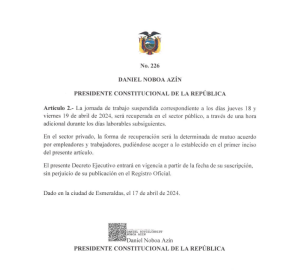 «Decreta suspender la jornada de trabajo, tanto para el sector público como para el privado, los días jueves 18 y viernes 19 de abril de 2024», sostiene le Decreto Ejecutivo 226.