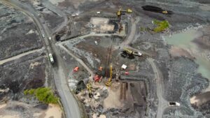 El tercer puente, de 25 metros de longitud, tiene un diseño similar al puente de 58 metros. Asimismo, trabajamos en la excavación para iniciar la cimentación de la base. Este puente será colocado en un punto intermedio entre los puentes más grandes.