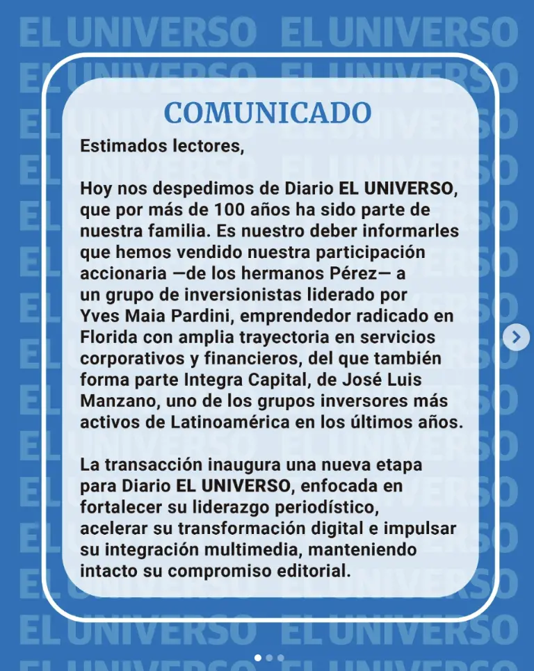 La familia Pérez, que durante más de un siglo mantuvo el control del medio, confirmó que vendió sus acciones a un grupo de inversionistas liderado por Yves Maia Pardini, emprendedor radicado en Florida con trayectoria en servicios corporativos y financieros.
