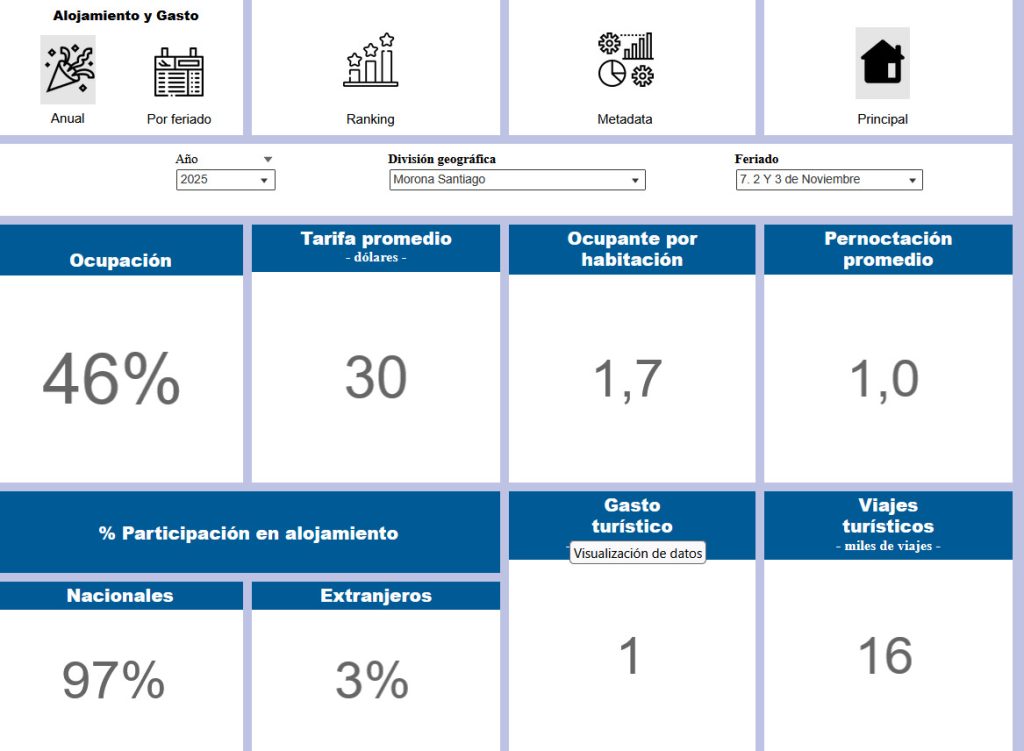 Además, según datos del Gobierno, a nivel nacional, la ocupación hotelera tuvo un promedio del 44,1%. Eso es un aumento de 11,6 puntos porcentuales en comparación con el mismo periodo de 2024, cuando se registró un 32,5 %, explicó la vocera.