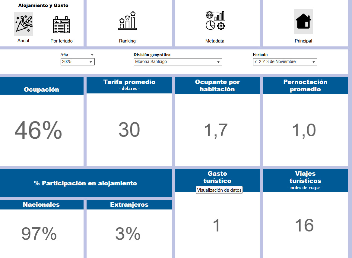 Durante el feriado nacional del 9 de octubre de 2025, Morona Santiago registró la mayor ocupación hotelera del Ecuador con un 61,8%, superando ampliamente el promedio nacional del 34,1%, según el Ministerio de Producción, Comercio Exterior e Inversiones.